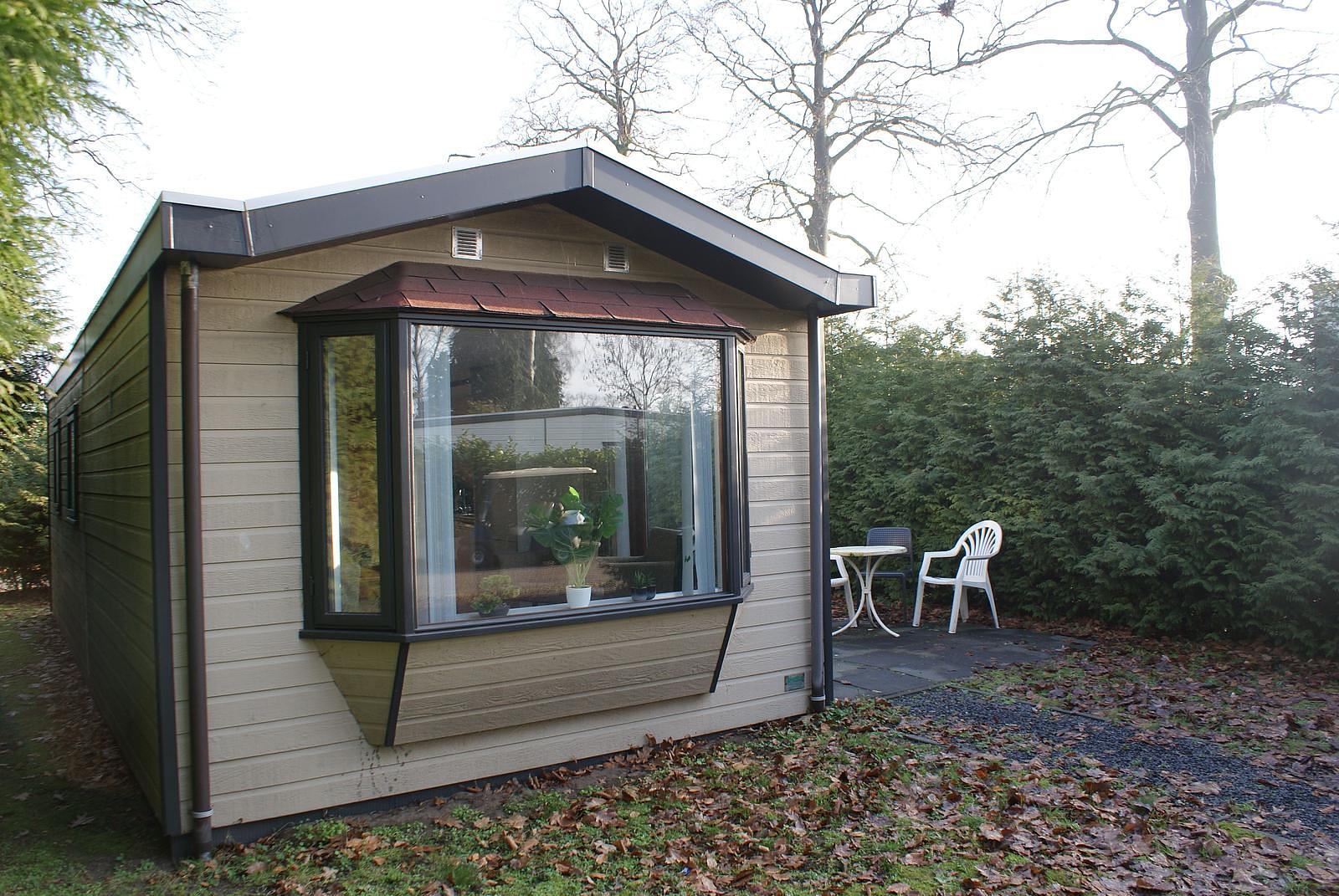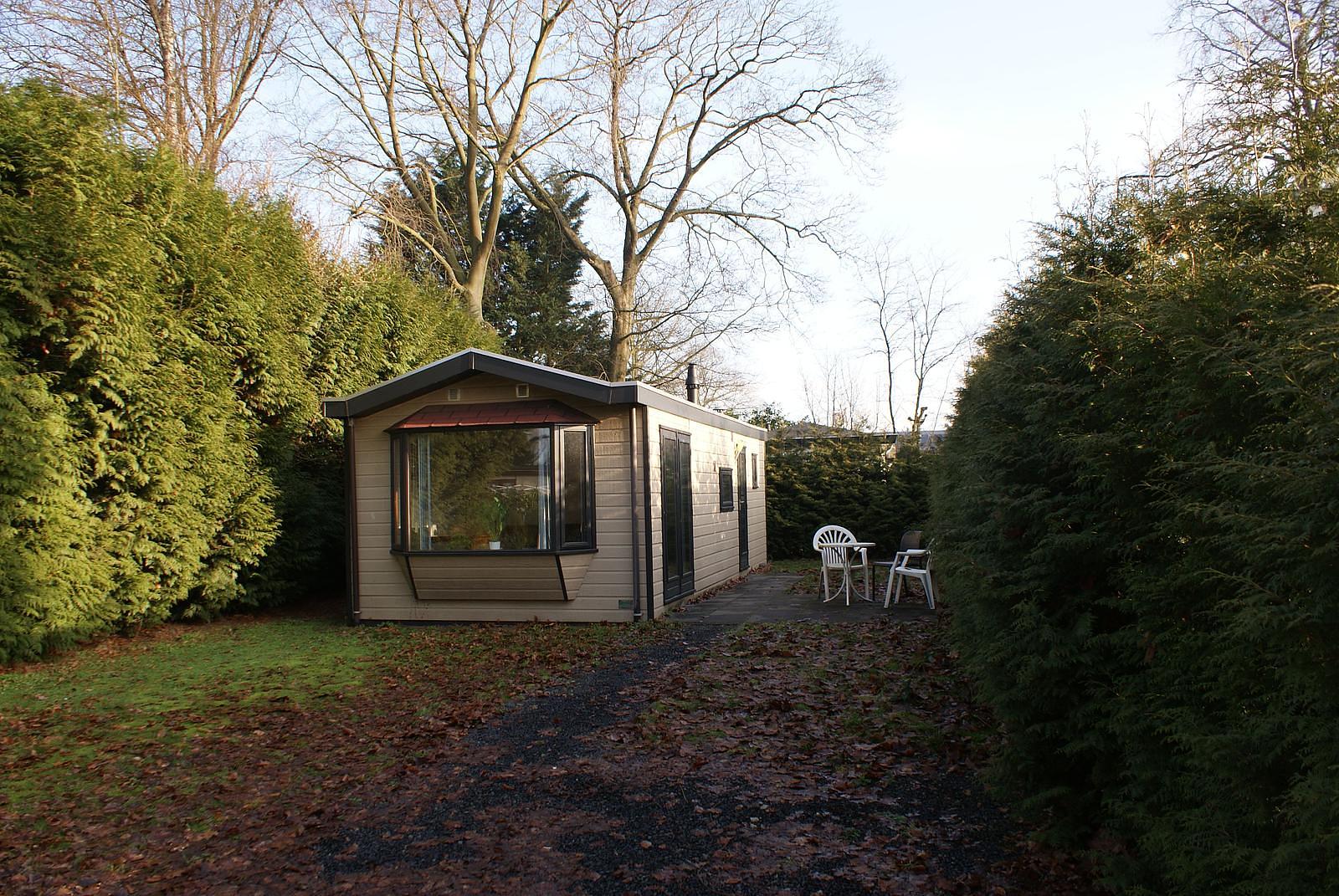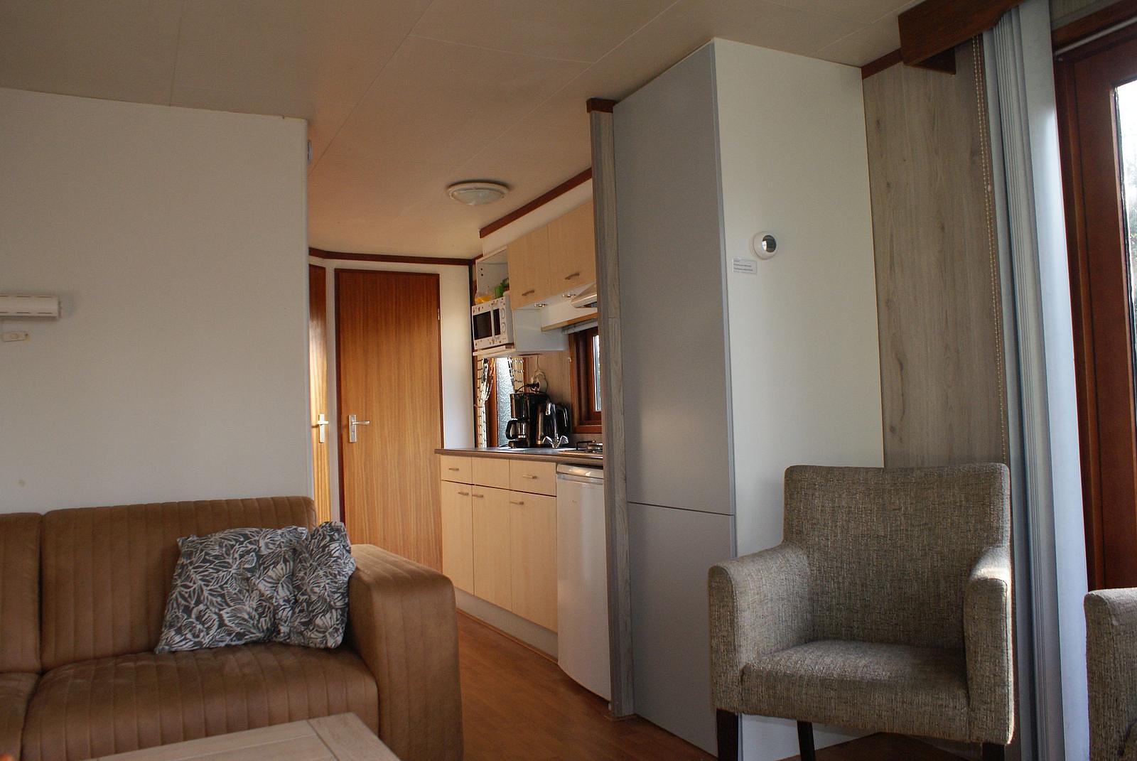 Entree. Knusse woonkamer met erker en openslaande deuren. De keuken is voorzien van een 4-pits gasstel, afzuigkap, losse magnetron en koelkast. Het chalet heeft 2 slaapkamers waarvan 1 met 1 2-persoons bed en de andere met een L-stapelbed met kastruimte eronder; dat gaan uw (klein)kinderen zeker leuk vinden...De volledig betegelde badkamer beschikt over een douche, wastafel en toilet. Het chalet wordt verwarmd middels CV. Buiten heeft u de beschikking over een onderhoudsarme tuin met veel groen. Zo kunt u nog vrije tijd kunt overhouden om veel van de mooie omgeving te kunnen genieten. Eigen parkeerplaats.