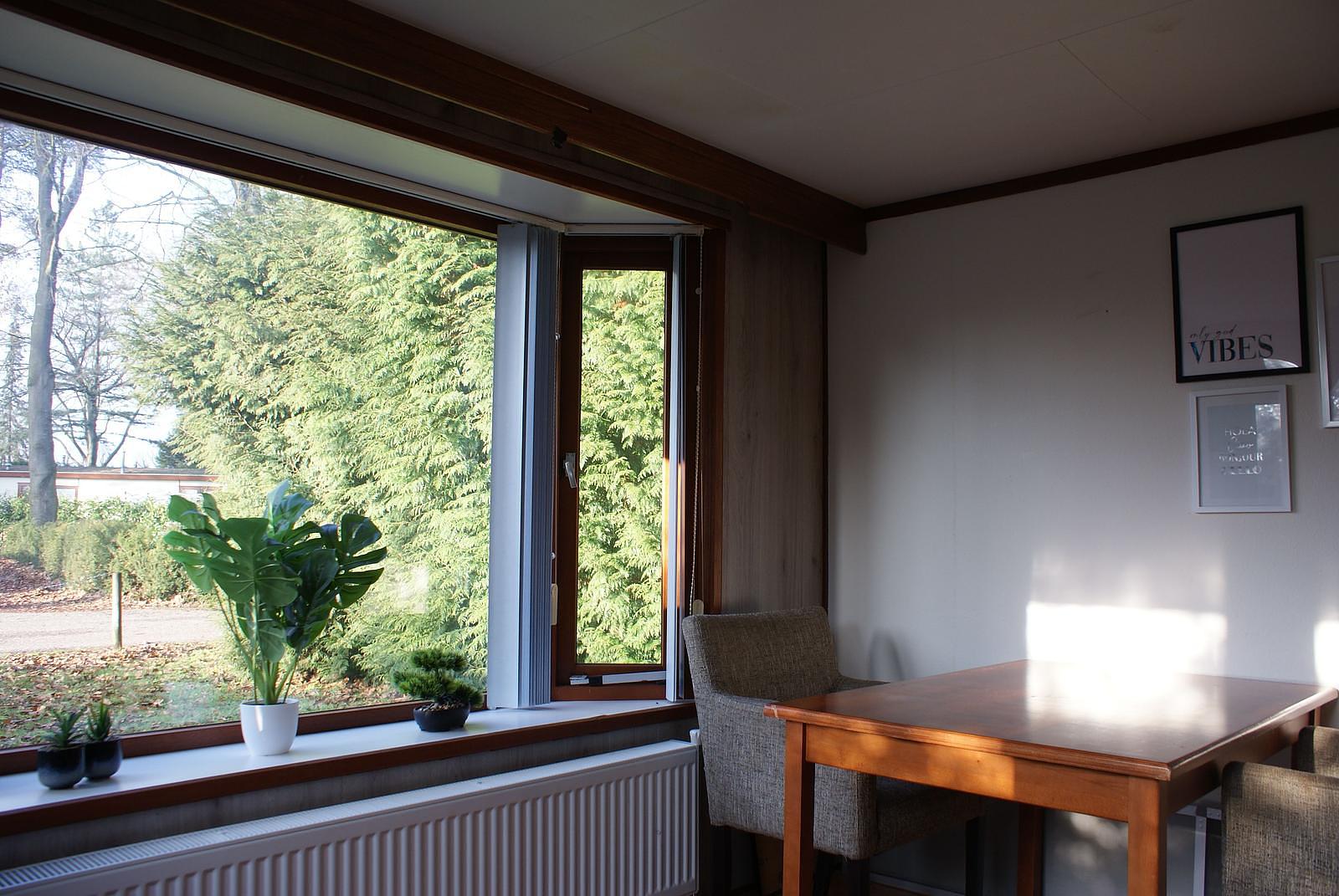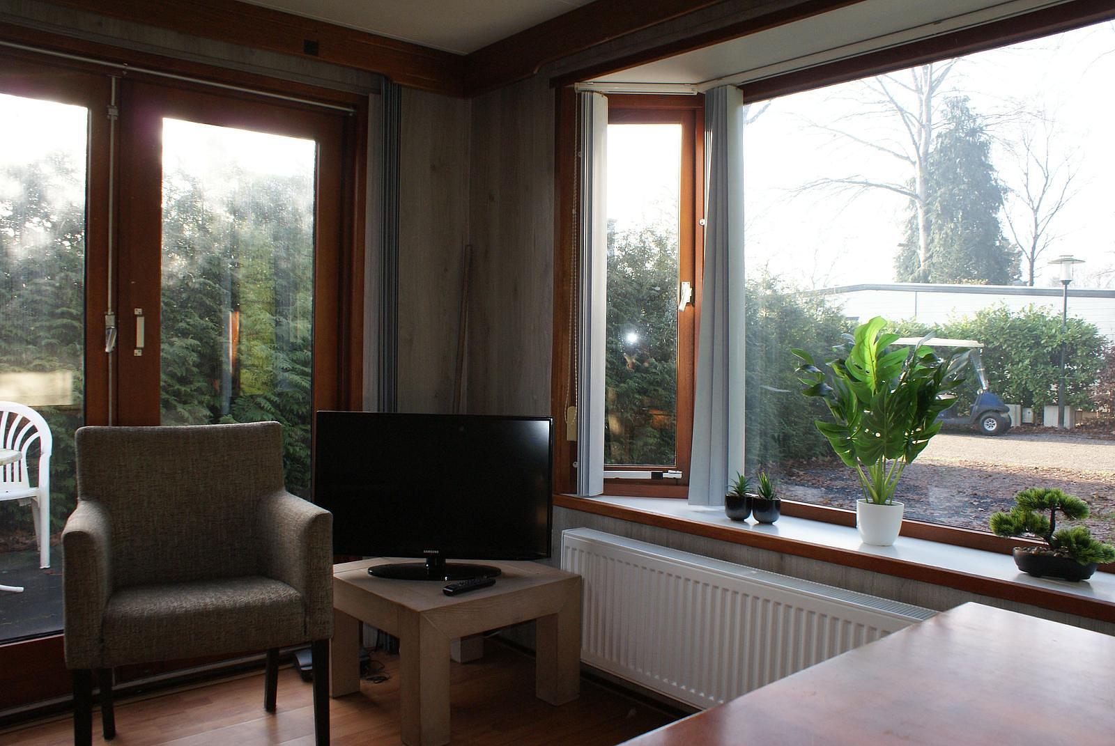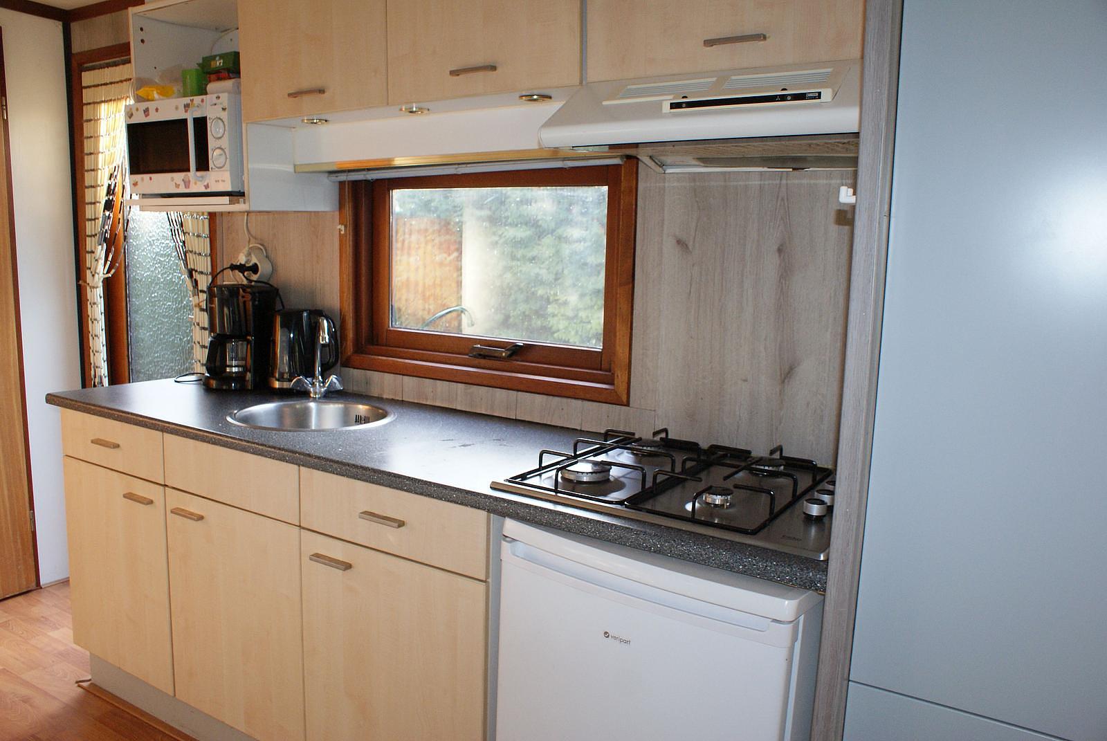 Entree. Knusse woonkamer met erker en openslaande deuren. De keuken is voorzien van een 4-pits gasstel, afzuigkap, losse magnetron en koelkast. Het chalet heeft 2 slaapkamers waarvan 1 met 1 2-persoons bed en de andere met een L-stapelbed met kastruimte eronder; dat gaan uw (klein)kinderen zeker leuk vinden...De volledig betegelde badkamer beschikt over een douche, wastafel en toilet. Het chalet wordt verwarmd middels CV. Buiten heeft u de beschikking over een onderhoudsarme tuin met veel groen. Zo kunt u nog vrije tijd kunt overhouden om veel van de mooie omgeving te kunnen genieten. Eigen parkeerplaats.