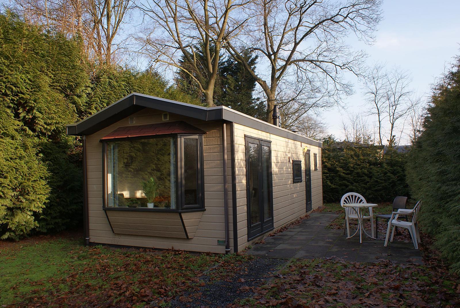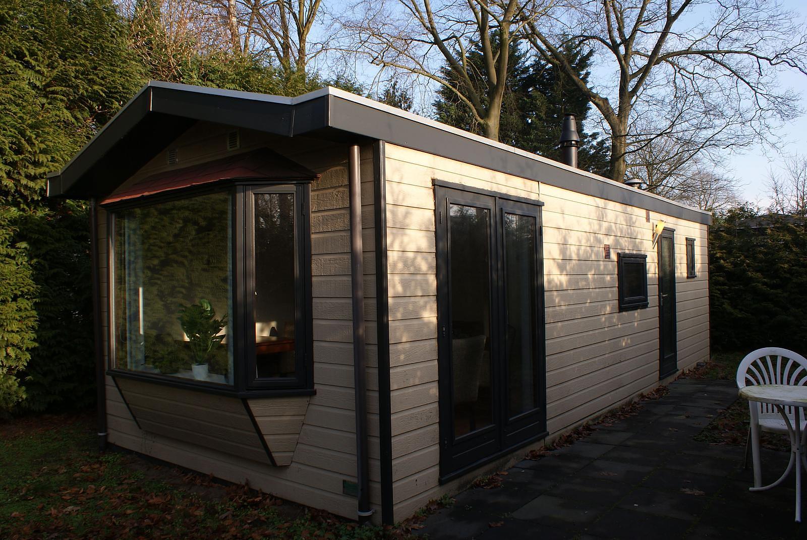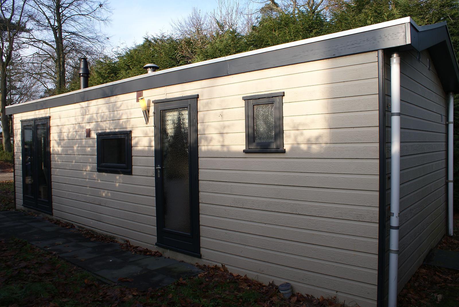 Net chalet van ca. 40 m2 met canexel buitenbekleding en kozijnen van hardhout. Gelegen op een kavel van ca.220 m2 met onderhoudsvriendelijke tuin.