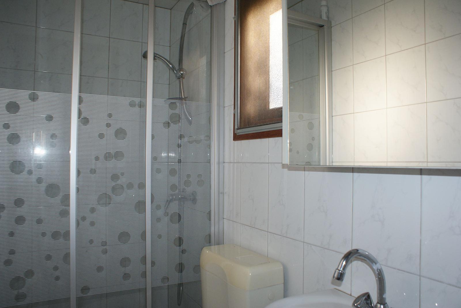 De volledig betegelde badkamer beschikt over een douche, wastafel en toilet.
