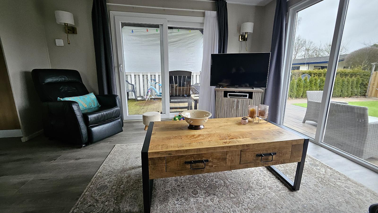 Entree. Ruime woonkamer met schuifpui en grote raampartijen voor extra lichtinval. Nette open keuken welke is voorzien van 4-pits gasstel, afzuigkap zonder afvoer met koolstoffilter en koelkast met vriesvak. Er zijn 2 slaapkamers aanwezig, met in de ene een 2-persoonsbed en in de andere een stapelbed en ruime opbergkast. De fraaie badkamer heeft douche, wastafel en toilet. Het chalet wordt verwarmd middels CV. Buiten heeft u de beschikking over een grote onderhoudsvriendelijke tuin met kunstgras. Berging.